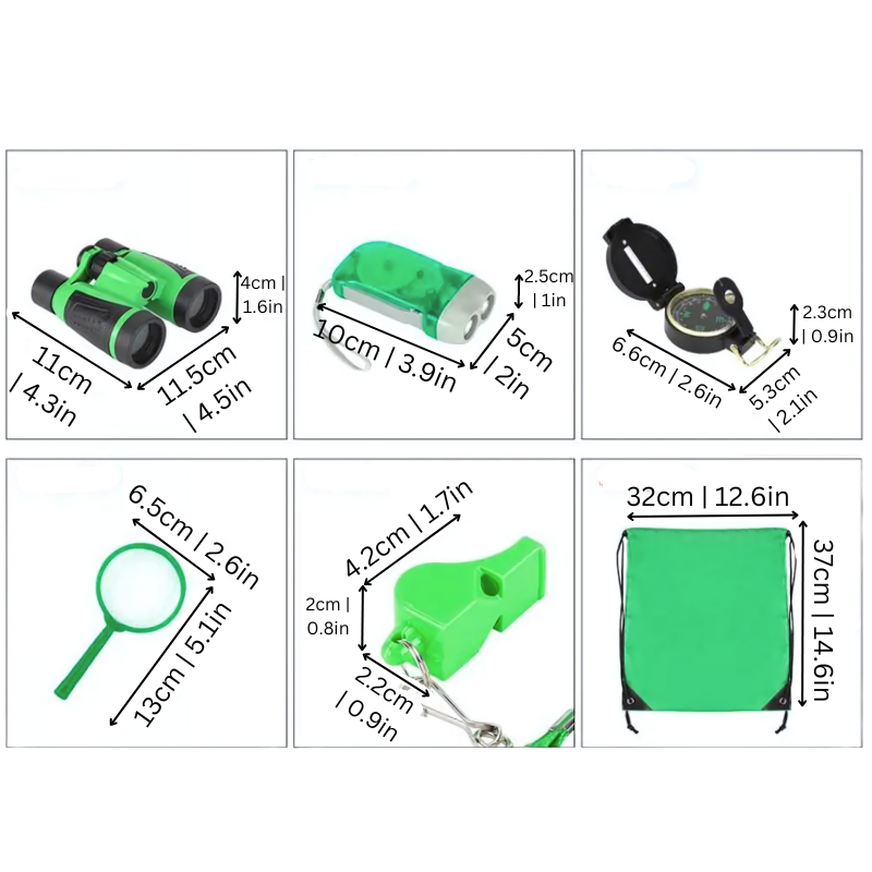 - Set beinhaltet: 1x Fernglas, 1x Lupe, 1x Taschenlampe, 1x Kompass, 1x Fuchspfiff & 1x Tasche